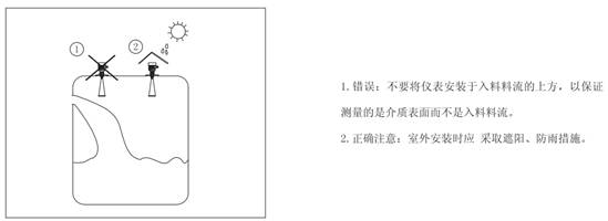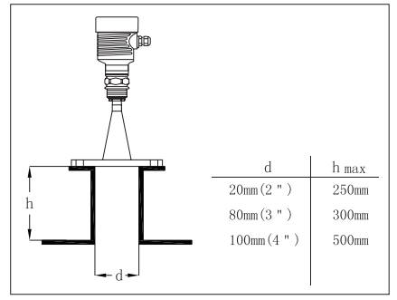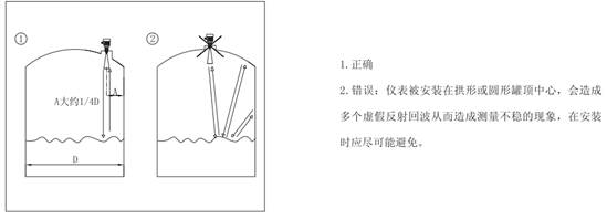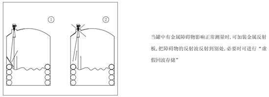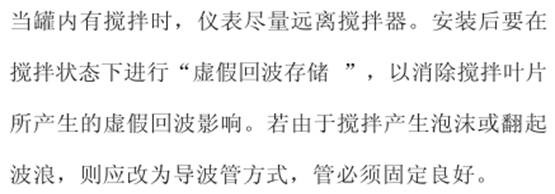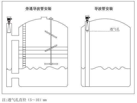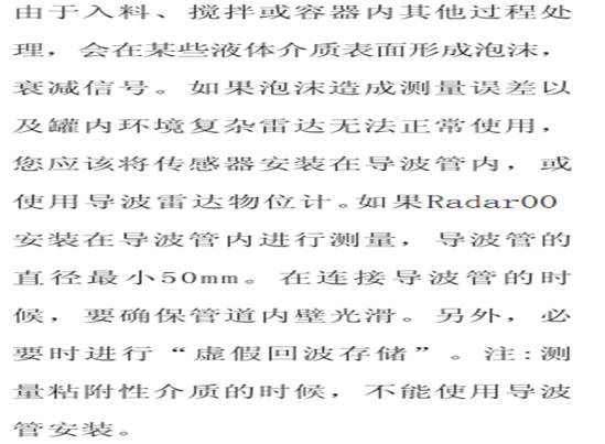 使用导波管安装(导波管或旁通管),可以避免容器内障碍物、泡沫对测量的影响。