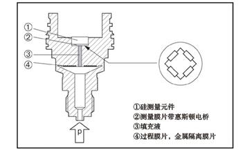 工作压力使隔离膜片产生偏移,并通过填充液把压力传送到 电阻桥路上(半导体技术),与压力相关的桥路输出电压的 变化,被测量并进一步处理。
