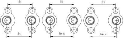 在压力容室上的流程连接孔是 1/4-18NPT。这些流程连接孔要求 螺纹密封。使用腰形法兰接头时只要拆下接头的上、下螺栓,就可以 轻易地把变送器从生产装置上拆下来。两流程连接孔的中心距是 54mm。旋转腰形法兰接头,中心距可以变为 50.8mm,54mm、57.2mm 如 图 2-5 所示 :
