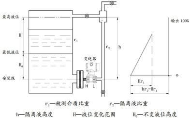 H=500mm,H0=100mm, h=1700mm 量程:ΔP=r1·1=1.4×500=2100(mmH2O) 负迁量:B=r2h-r1H0=0.8×700-1.4×100=1220(mmH2O)